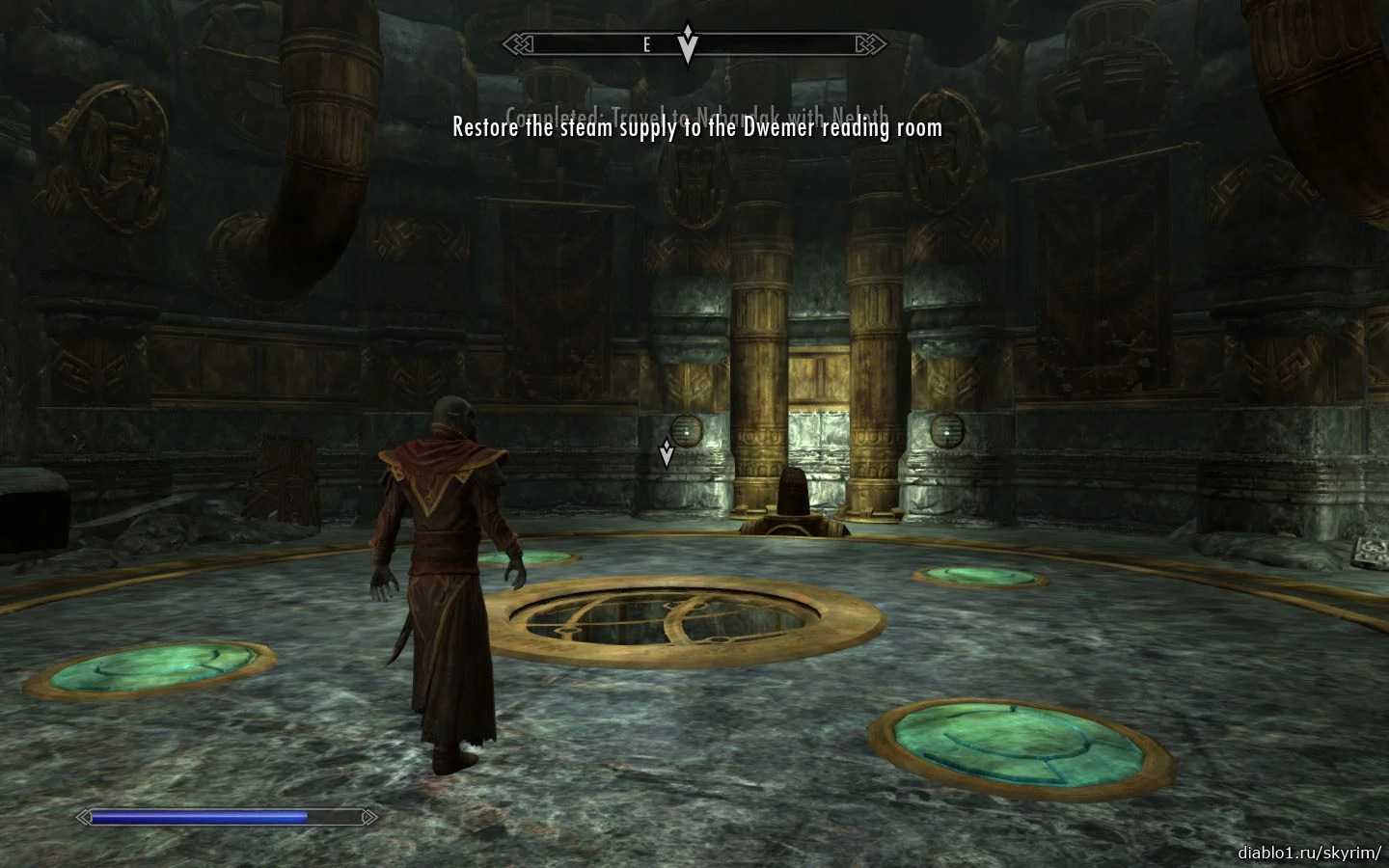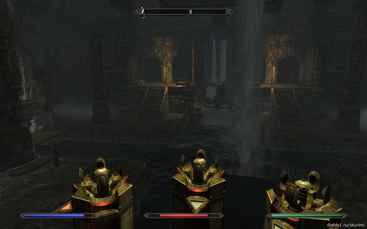 В чем суть: на входе вы увидите стойку с книгой спрятанную под полом. Чтобы ее получить, нужно на самых нижних уровнях установить 4 двемерских куба в нужные стойки. А чтобы пройти к этим стойкам, нужно будет изрядно попотеть: