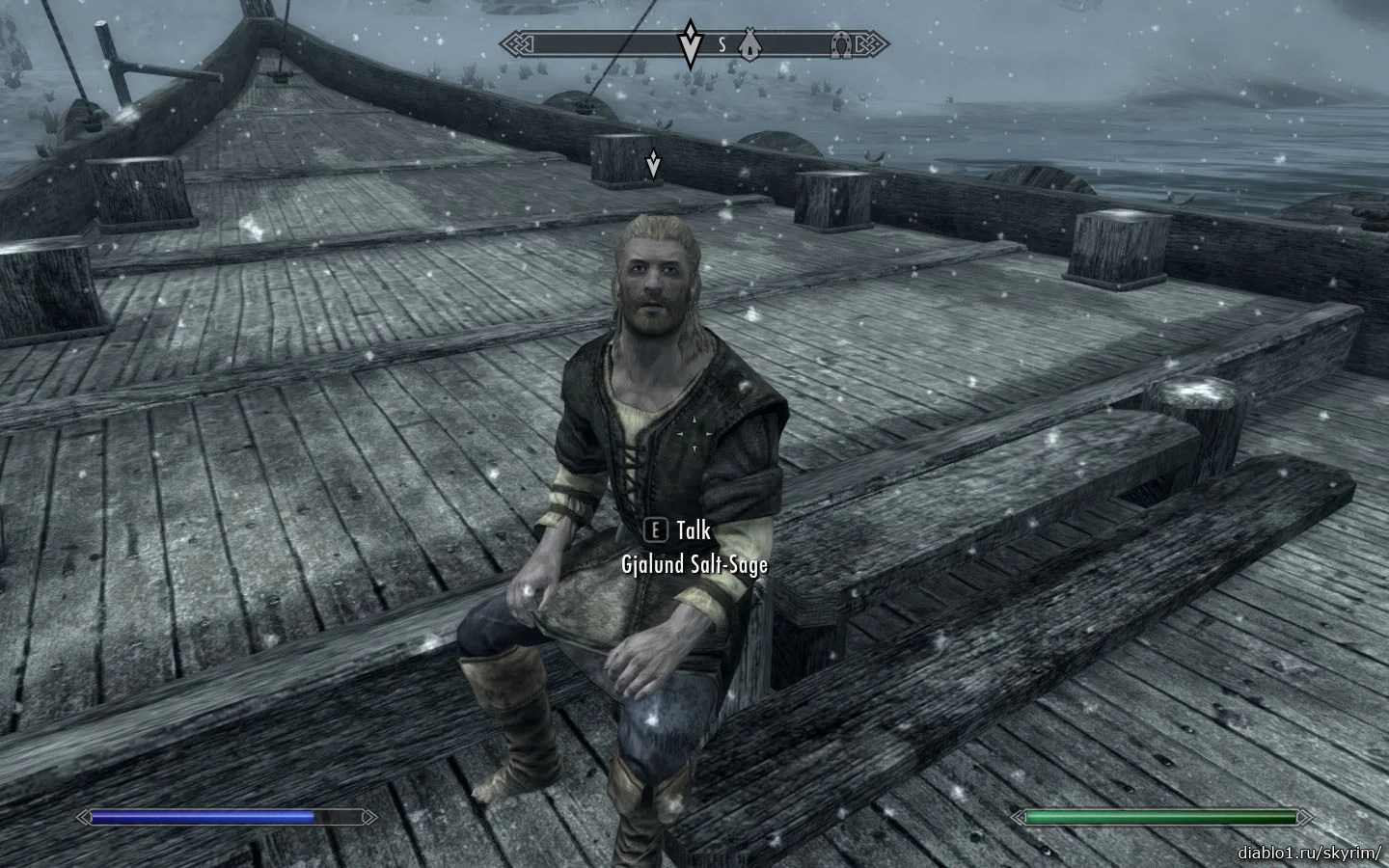 На месте находим Гьялунд Морской Волк (Gjalund Salt-Sage), и говорим о том, что нам нужно попасть на Солстхейм:
