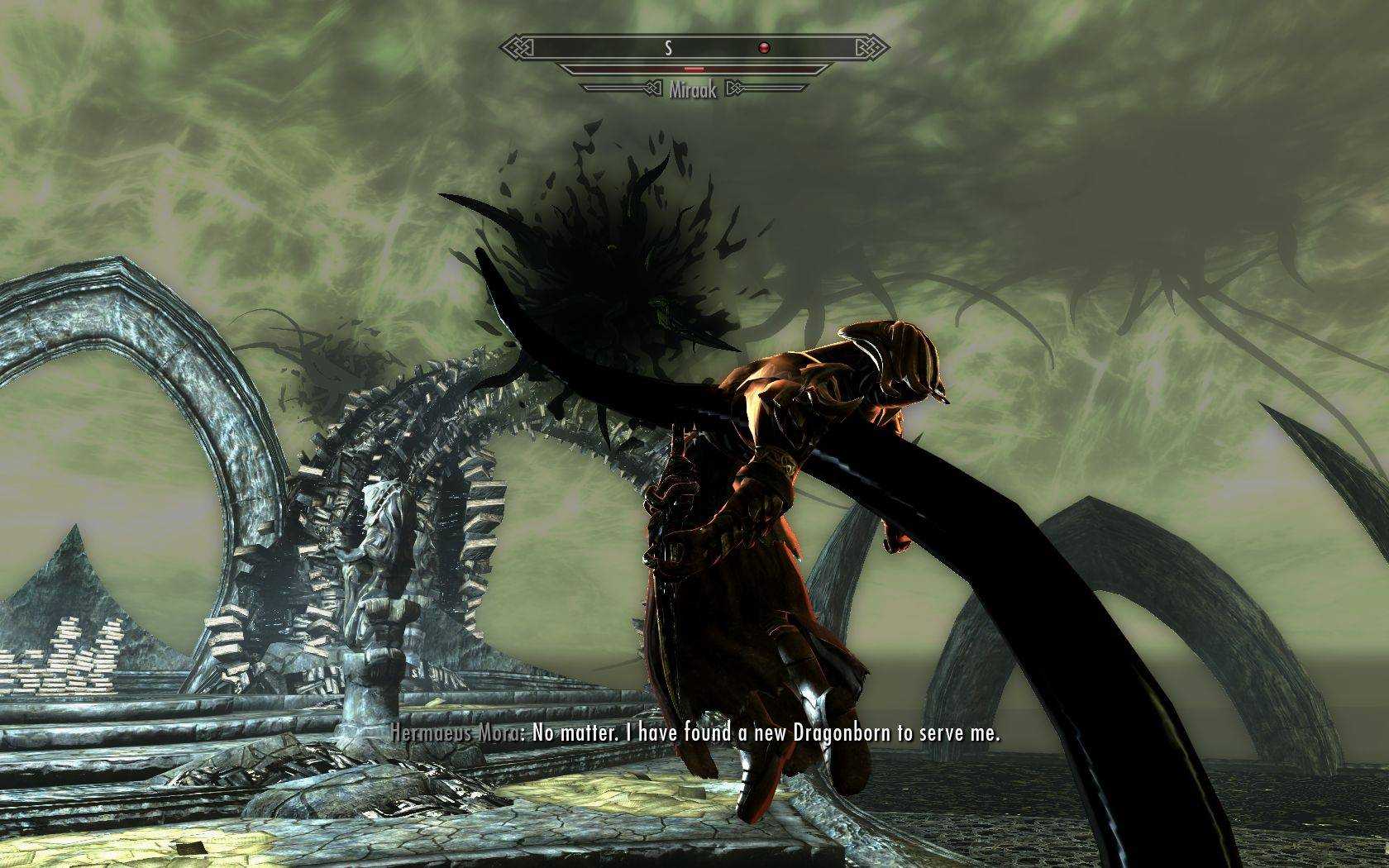 Разговоры будут недолгими, начнется сражение. Важная особенность: каждый раз, когда Мирак, кажется, уже близок к смерти, он становится неуязвим и восстанавливает здоровье, поглощая душу и жертвуя одним из драконов: Крузикрелом, Релоникивом и наконец Саротаром. После третьего восстановления жертвовать уже некем, усильте напор. Когда здоровье злодея снизится, на сцену явится Хермеус Мора и сам разделается со своим бывшим слугой. Принц заявит, что Мирак ему больше не нужен, он нашел другого Драконорожденного (то есть — вас!). Умирая, Мирак желает вам повторения своей судьбы. Все кончено. От всемогущего драконьего жреца, предавшего своих хозяев, остался лишь скелет.