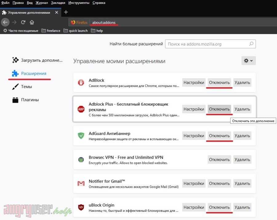 Чтобы полностью отключить сторонние блокировщики рекламы в Firefox, откройте меню расширений браузера. Для этого введите «about:addons» в адресную строку. Далее нажмите отключить рядом с теми расширениями, работу которых необходимо остановить.