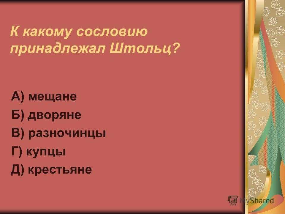 К какому сословию принадлежал Штольц? А) мещане Б) дворяне В) разночинцы Г) купцы Д) крестьяне