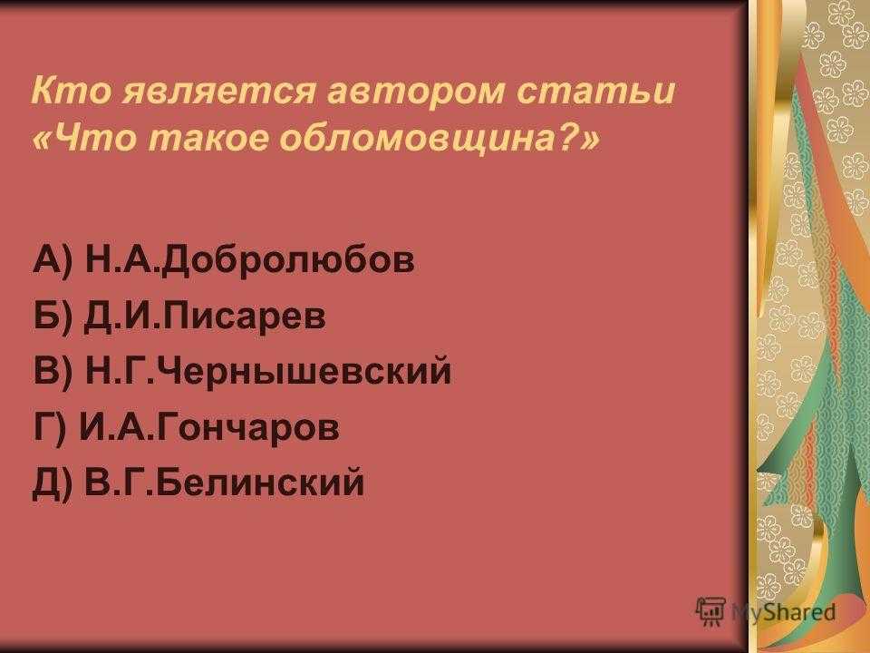 Кто является автором статьи «Что такое обломовщина?» А) Н.А.Добролюбов Б) Д.И.Писарев В) Н.Г.Чернышевский Г) И.А.Гончаров Д) В.Г.Белинский