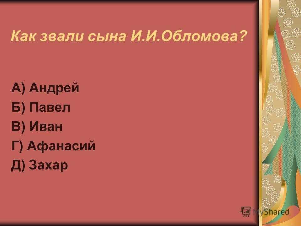Как звали сына И.И.Обломова? А) Андрей Б) Павел В) Иван Г) Афанасий Д) Захар