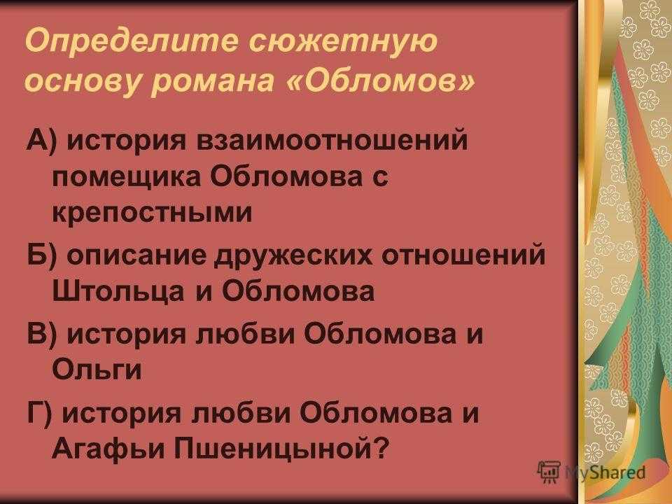 Определите сюжетную основу романа «Обломов» А) история взаимоотношений помещика Обломова с крепостными Б) описание дружеских отношений Штольца и Обломова В) история любви Обломова и Ольги Г) история любви Обломова и Агафьи Пшеницыной?