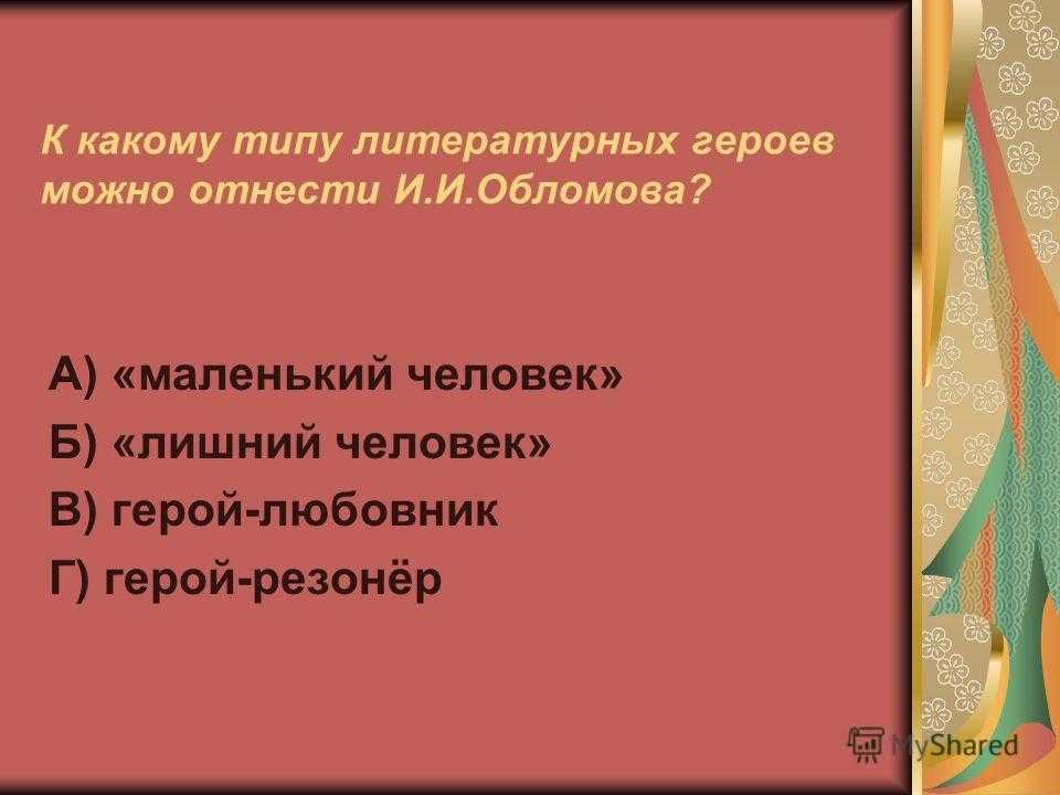 К какому типу литературных героев можно отнести И.И.Обломова? А) «маленький человек» Б) «лишний человек» В) герой-любовник Г) герой-резонёр