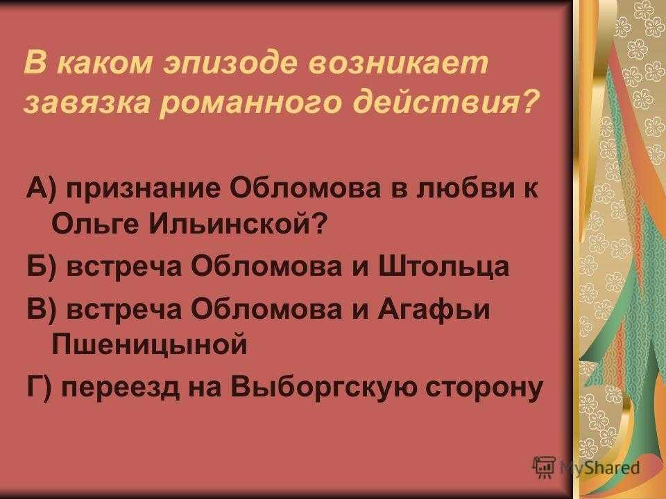 В каком эпизоде возникает завязка романного действия? А) признание Обломова в любви к Ольге Ильинской? Б) встреча Обломова и Штольца В) встреча Обломова и Агафьи Пшеницыной Г) переезд на Выборгскую сторону
