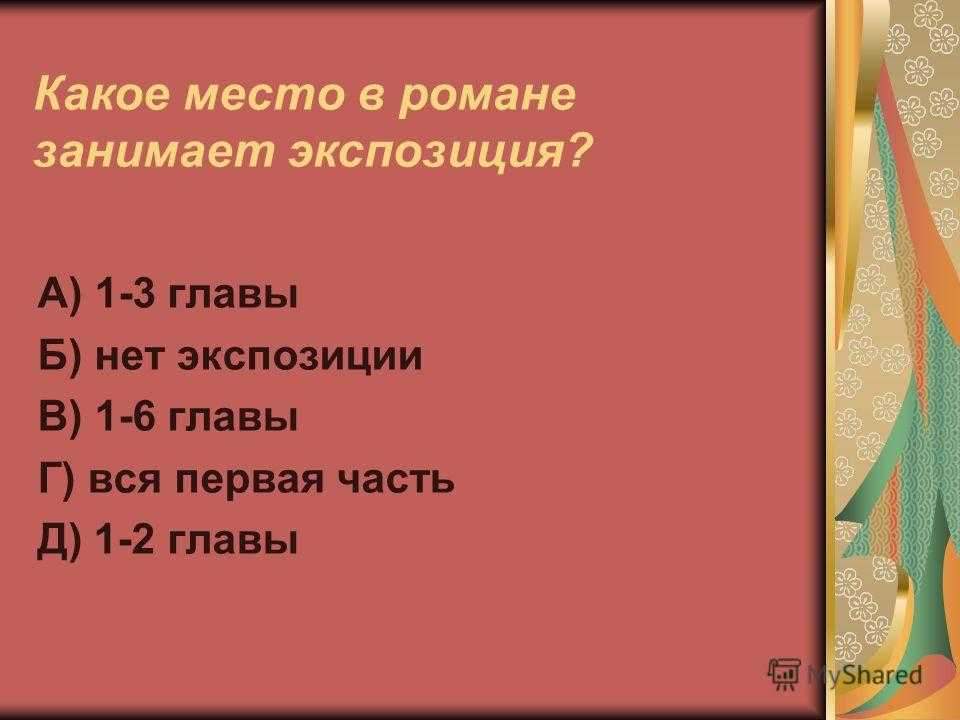Какое место в романе занимает экспозиция? А) 1-3 главы Б) нет экспозиции В) 1-6 главы Г) вся первая часть Д) 1-2 главы