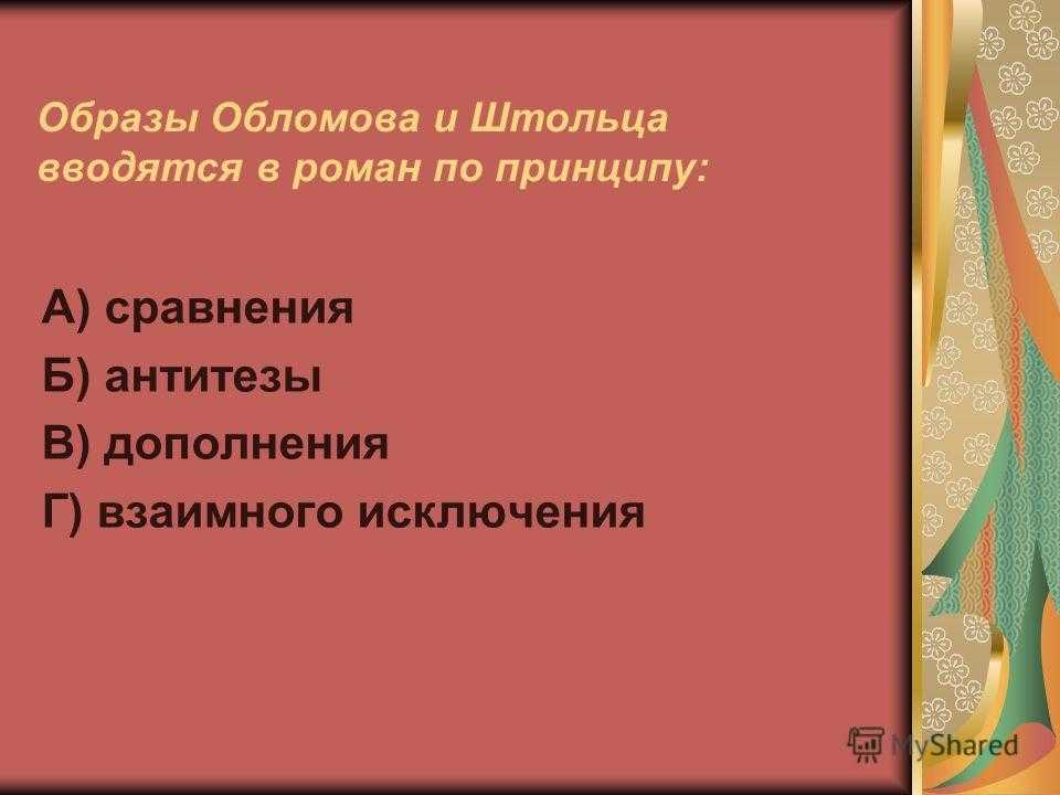 Образы Обломова и Штольца вводятся в роман по принципу: А) сравнения Б) антитезы В) дополнения Г) взаимного исключения