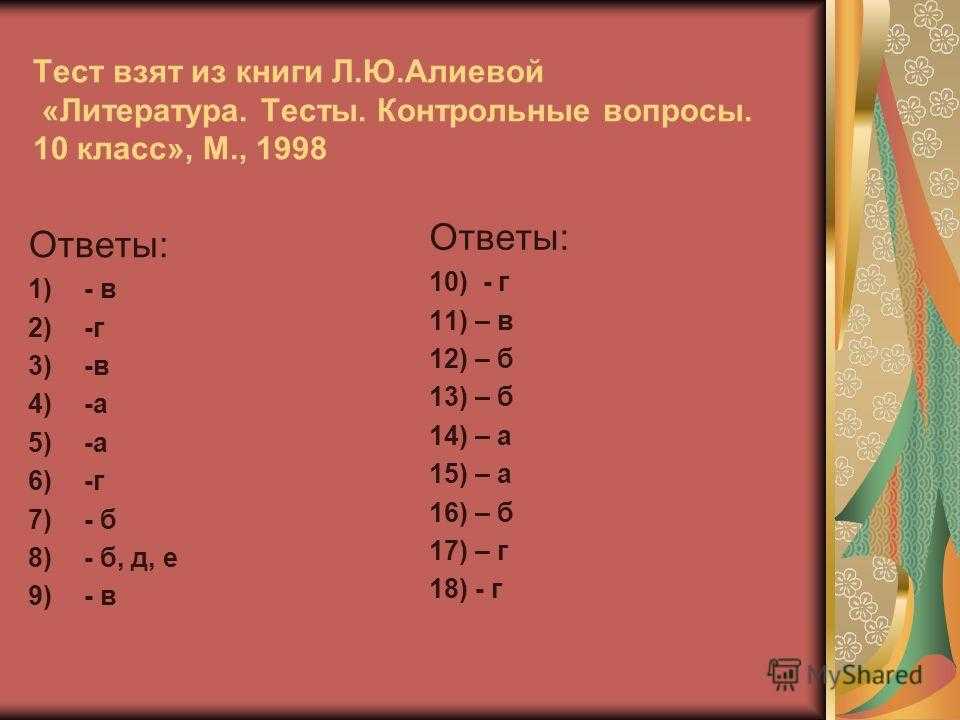 Тест взят из книги Л.Ю.Алиевой «Литература. Тесты. Контрольные вопросы. 10 класс», М., 1998 Ответы: 1)- в 2)-г 3)-в 4)-а 5)-а 6)-г 7)- б 8)- б, д, е 9)- в Ответы: 10) — г 11) – в 12) – б 13) – б 14) – а 15) – а 16) – б 17) – г 18) — г
