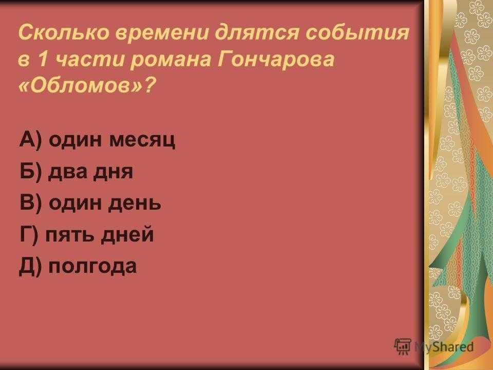 Сколько времени длятся события в 1 части романа Гончарова «Обломов»? А) один месяц Б) два дня В) один день Г) пять дней Д) полгода