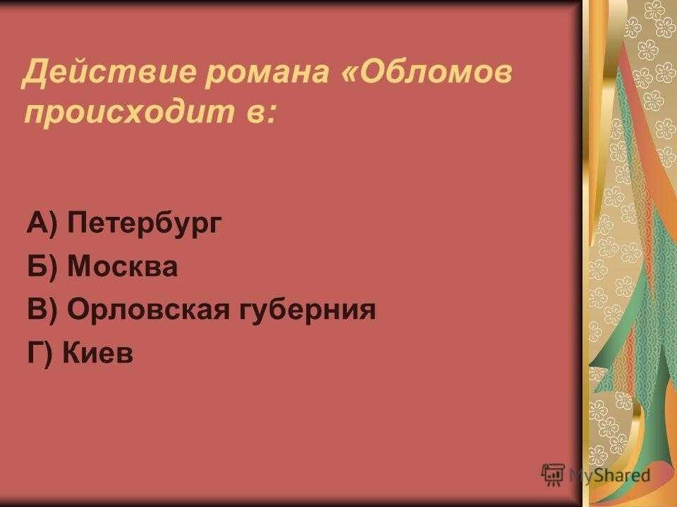 Действие романа «Обломов происходит в: А) Петербург Б) Москва В) Орловская губерния Г) Киев