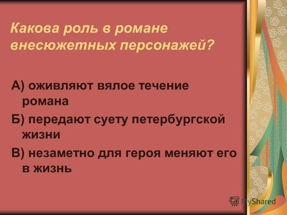 Какова роль в романе внесюжетных персонажей? А) оживляют вялое течение романа Б) передают суету петербургской жизни В) незаметно для героя меняют его в жизнь
