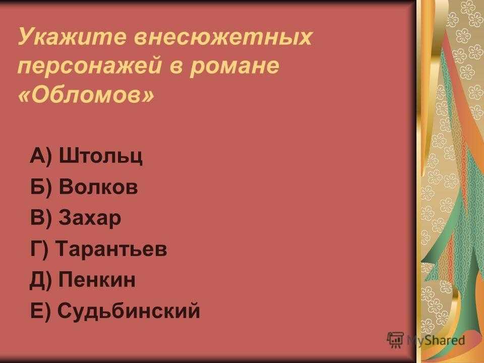 Укажите внесюжетных персонажей в романе «Обломов» А) Штольц Б) Волков В) Захар Г) Тарантьев Д) Пенкин Е) Судьбинский