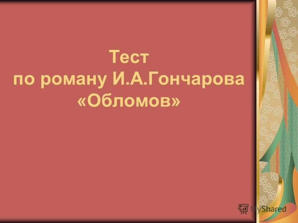 Презентация на тему: » Тест по роману И.А.Гончарова «Обломов». Сколько времени длятся события в 1 части романа Гончарова «Обломов»? А) один месяц Б) два дня В) один день Г)» — Транскрипт: