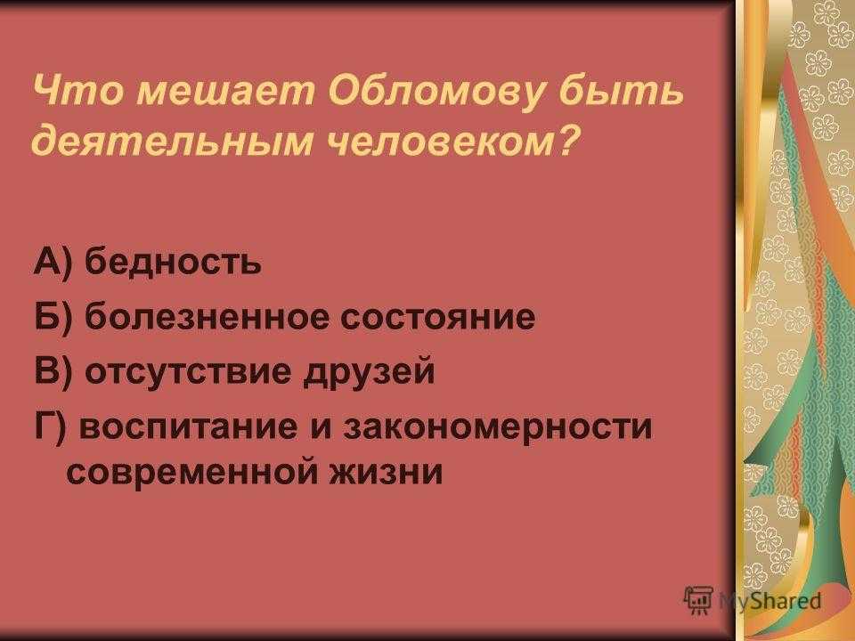 Что мешает Обломову быть деятельным человеком? А) бедность Б) болезненное состояние В) отсутствие друзей Г) воспитание и закономерности современной жизни