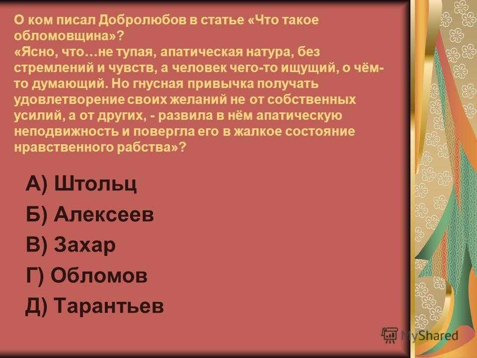 О ком писал Добролюбов в статье «Что такое обломовщина»? «Ясно, что…не тупая, апатическая натура, без стремлений и чувств, а человек чего-то ищущий, о чём- то думающий. Но гнусная привычка получать удовлетворение своих желаний не от собственных усилий, а от других, — развила в нём апатическую неподвижность и повергла его в жалкое состояние нравственного рабства»? А) Штольц Б) Алексеев В) Захар Г) Обломов Д) Тарантьев