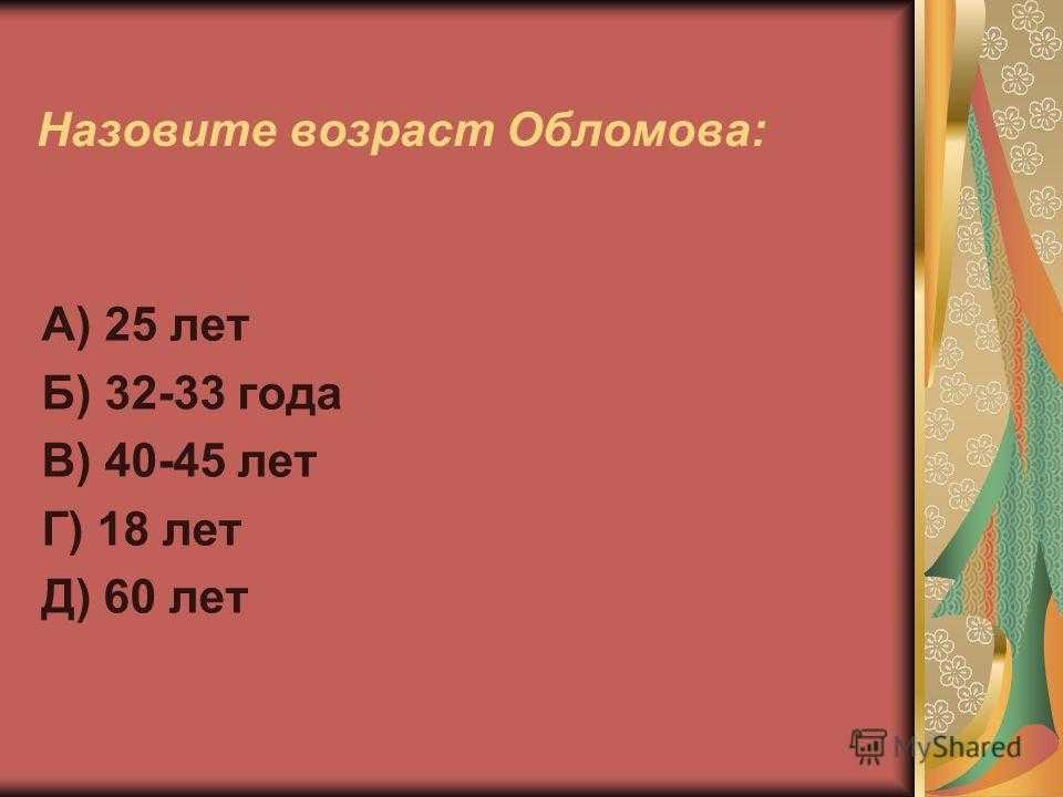 Назовите возраст Обломова: А) 25 лет Б) года В) лет Г) 18 лет Д) 60 лет