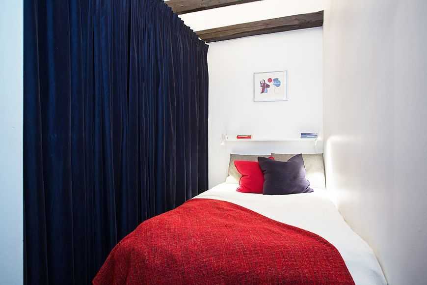 В проекте интерьера студийной квартиры дизайнер решил не тратить драгоценные квадратные метры на отдельную спальню и отгородил маленький уголок для кровати рядом с прихожей. Внутри уместился даже шкаф за занавеской. Мини комната не имеет двери.