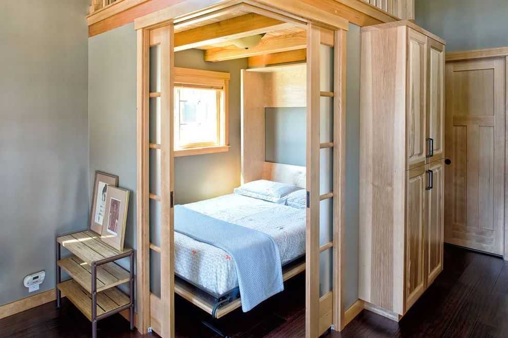 Раздвижные перегородки. В данном примере кровать в углу комнаты отделена двумя небольшими перегородками, в которые встроены раздвижные двери. Когда двери в закрытом положении, не каждый догадается, что за ними спальня. В то же время, можно держать двери открытыми постоянно, чтобы сохранялось ощущение большого пространства.
