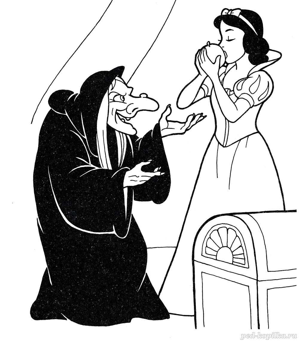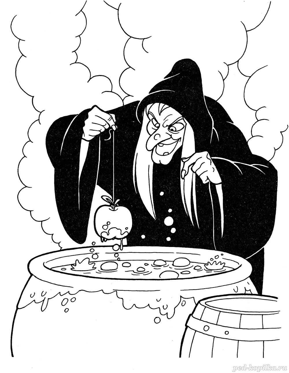 Она была злой колдуньей и решила покончить со своей падчерицей при помощи злого волшебства. Королева превратилась в противную старуху и приготовила отравленное яблоко. Тот, кто съест это яблоко, заснёт навеки мёртвым сном. И с этим отравленным яблоком колдунья отправилась к лесному жилищу Белоснежки.