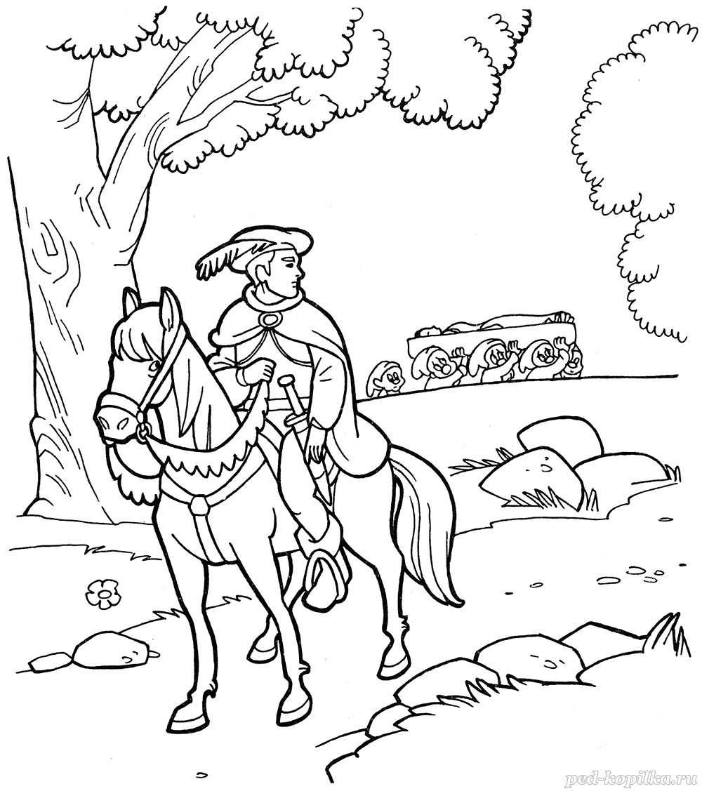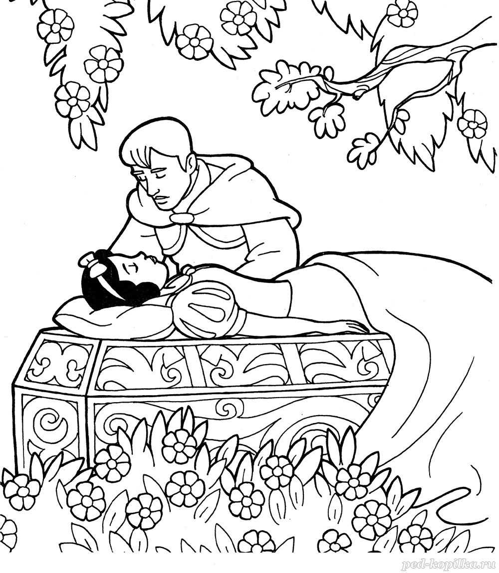 И вот долго-долго лежала в своем гробу Белоснежка, и казалось, что она спит, — была она бела, как снег, румяна, как кровь, и черноволоса, как черное дерево. Но случилось, что заехал однажды королевич в тот лес, и попал он в дом гномов, чтобы в нем переночевать. Увидел он на горе гроб, а в нем прекрасную Белоснежку, и прочел, что было написано на нем золотыми буквами. И сказал он тогда гномам: