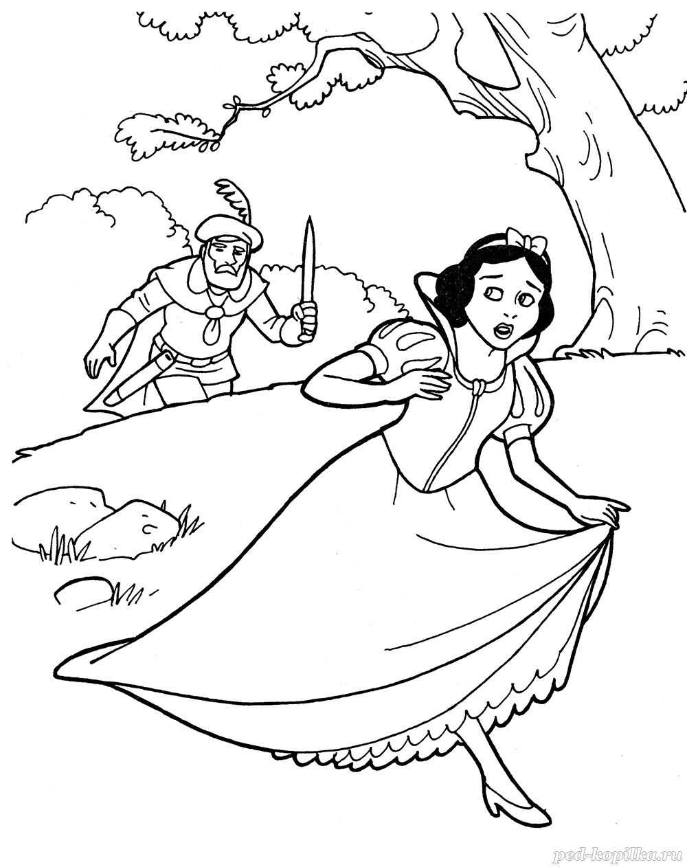 Слуга действительно заманил Белоснежку в лес. Но когда он выхватил кинжал, чтобы выполнить приказ королевы, Белоснежка успела увидеть опасность и бросилась прочь. Слуга кинулся за ней, но не смог догнать беглянку. Целый день и всю ночь бродила девушка по лесу в поисках дороги.