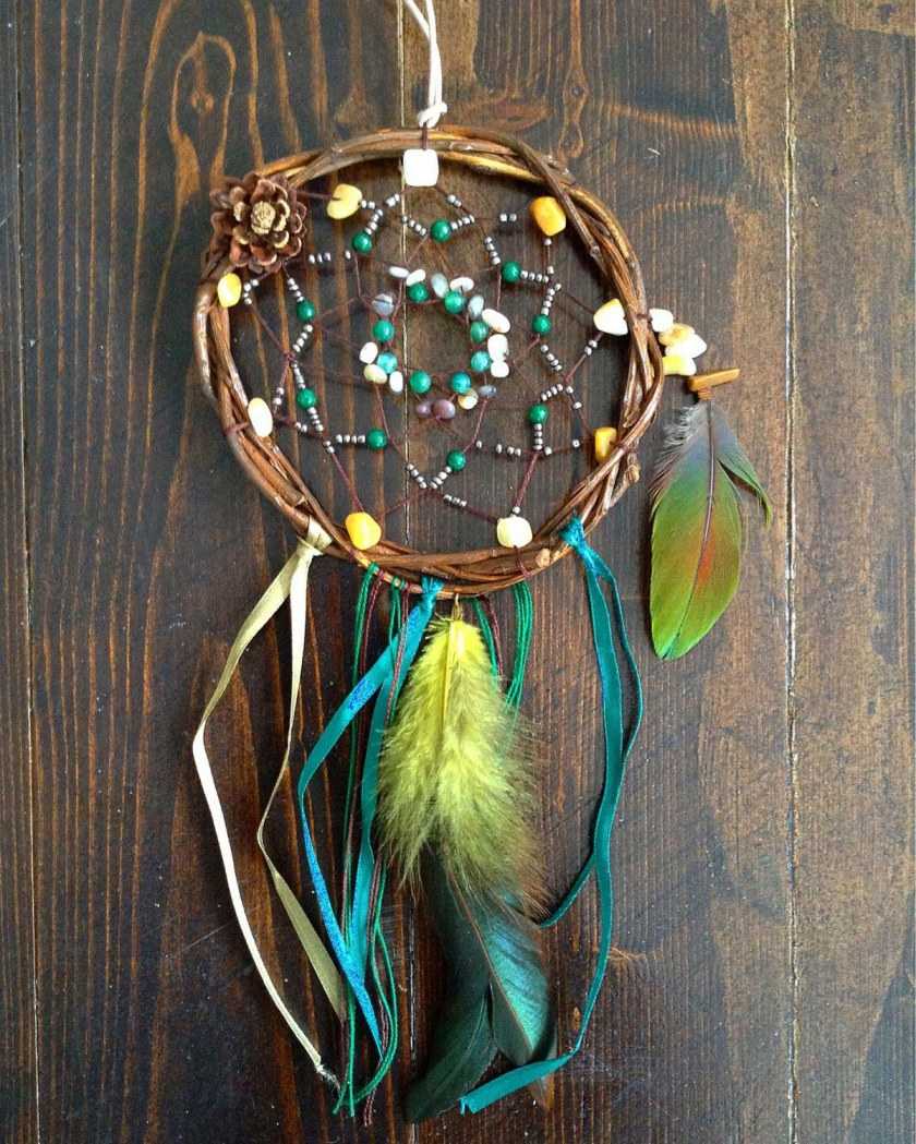 Теперь можно украсить ловец снов. В оригинальном дизайне использовалось небольшое перо, свисающее с нижней части обруча или из центра паутины. Бусина была включена в плетение паутины где-то посередине или ближе к центру. Когда научитесь хорошо плести, сможете включать бусины в ловец снов
