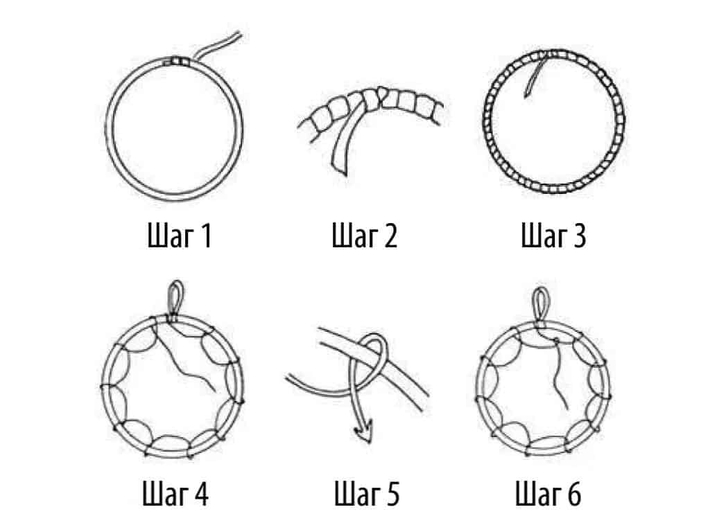 Шаг 7. После того как первый круг замкнулся, необходимо продеть свободный край нити в иглу, чтобы было удобно соблюдать последовательность техники плетения, создавая второй ряд.