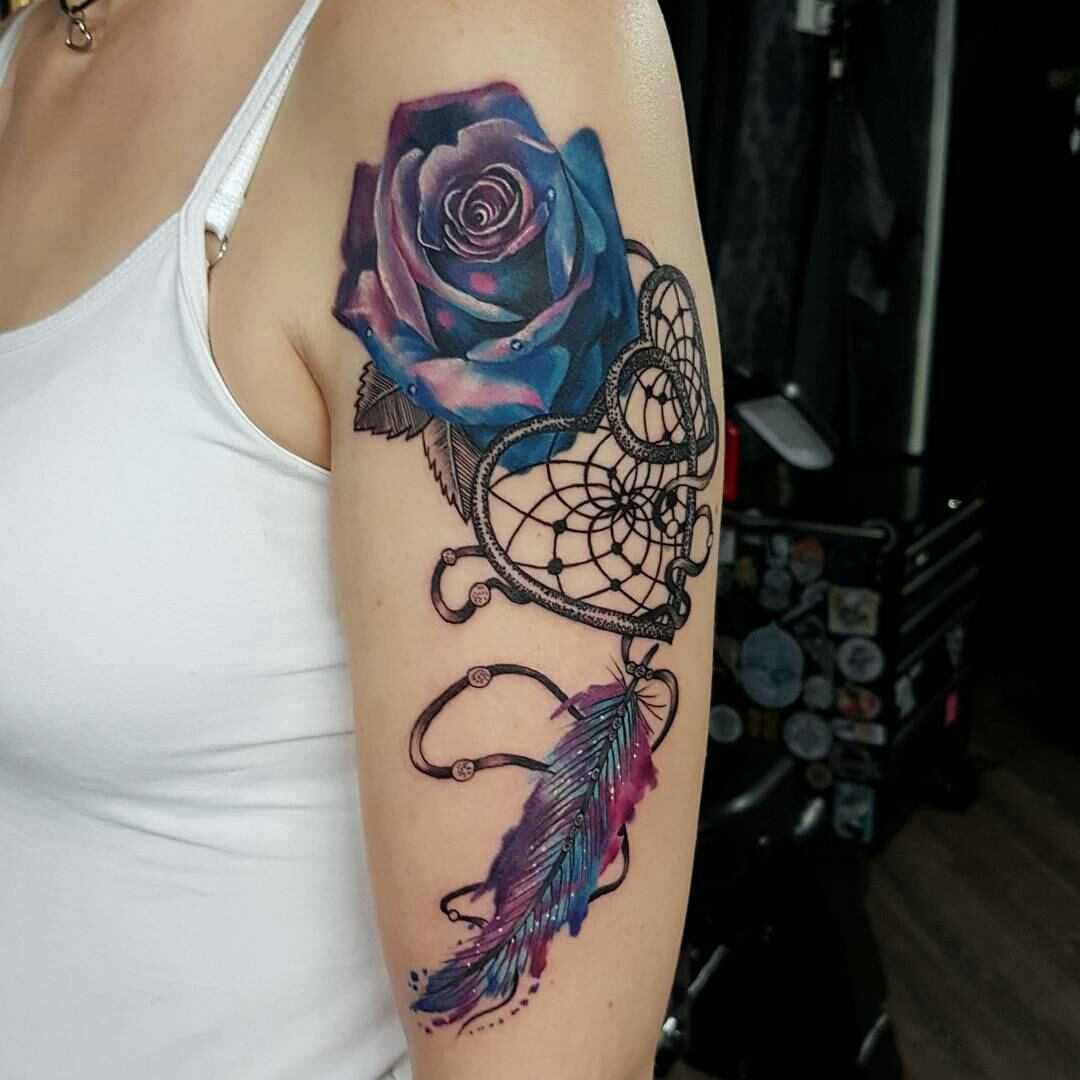 Дату с изображением ловца снов можно наносить и на плечо. Это может быть как яркий красочный дизайн, так и простой черный. Невозможно не отметить тату Ловца снов с элементом ярко-розовых роз. Этот вариант смотрится очень оригинально и нежно. Если нет желания использовать броские цвета, то розы свполне могут быть черно-белыми, либо белыми. Они также очаровательны.