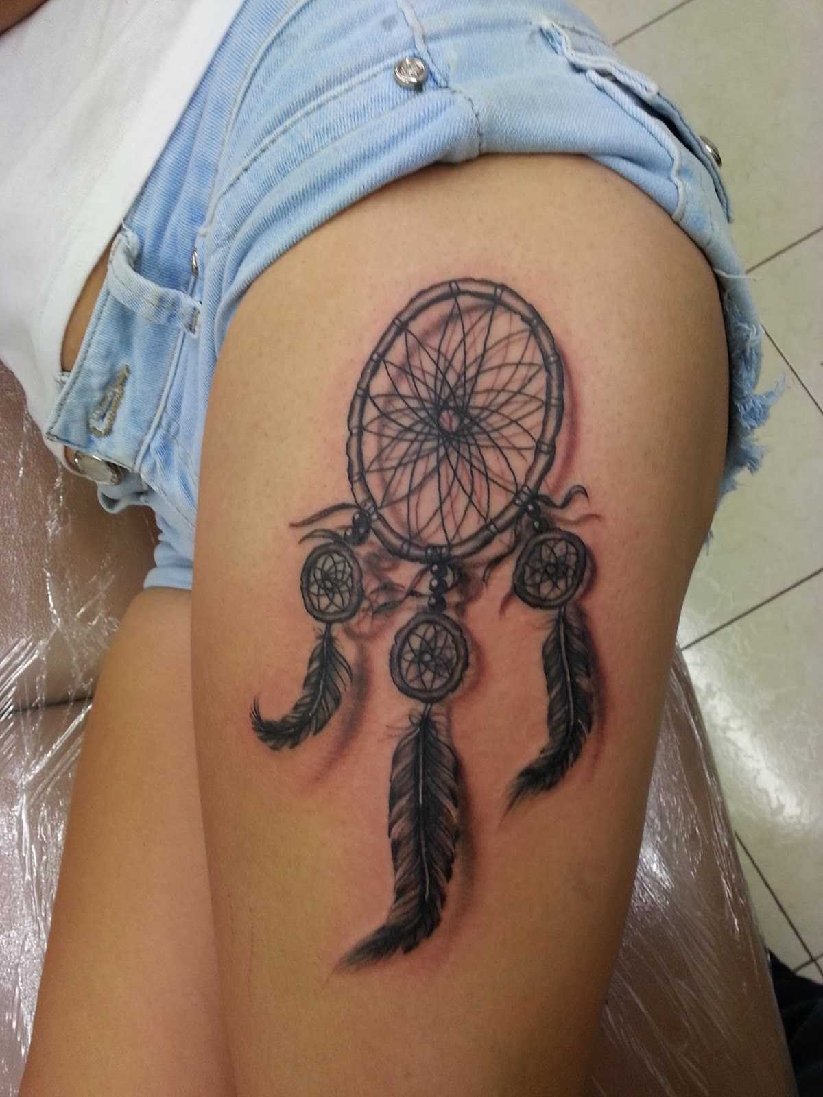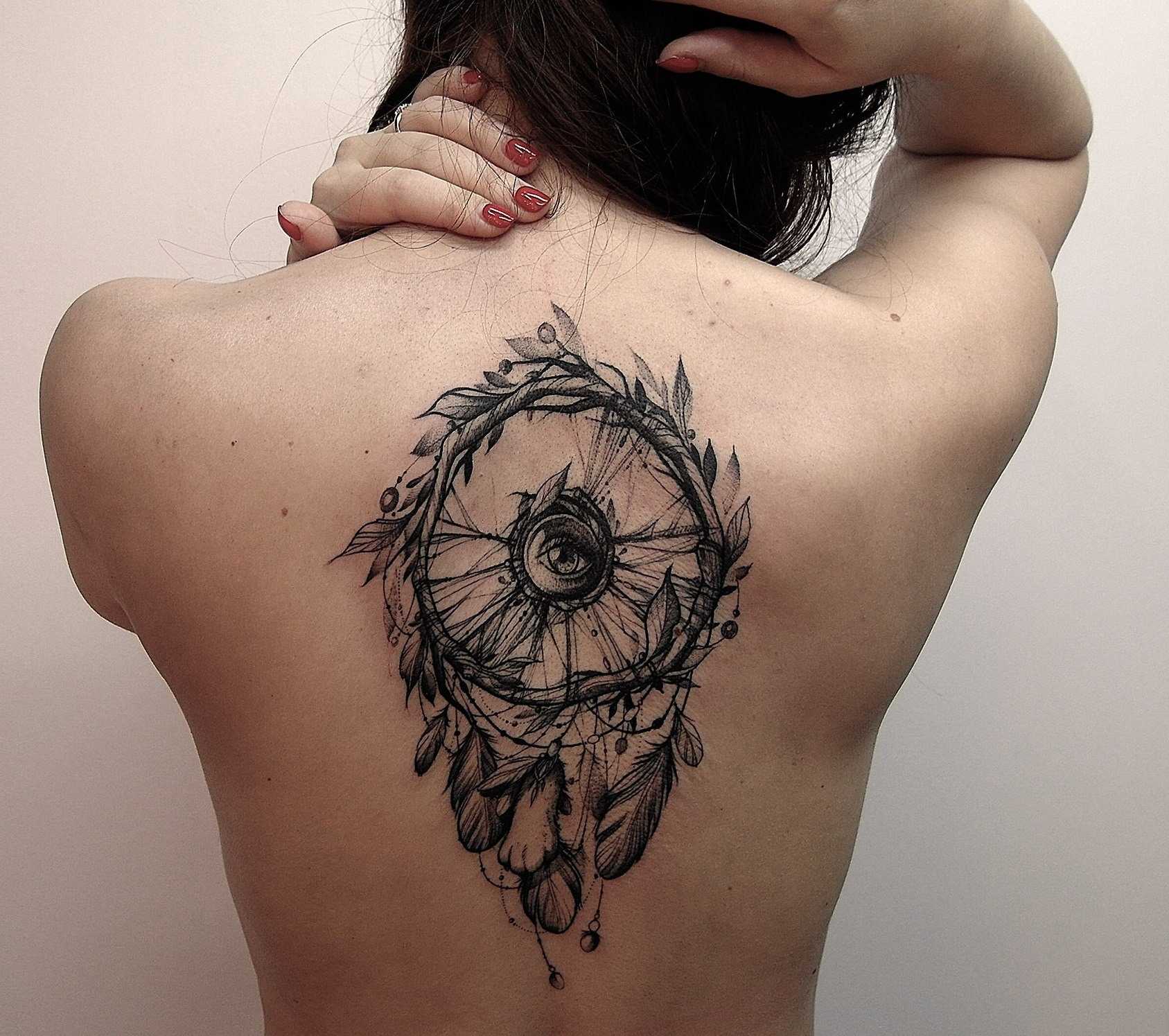 Ловец снов набитый на спине либо лопатке символизирует желание свободы выбора. Барышня находится в поисках своего жизненного пути, а амулет помогает не заплутать и ведет к светлому будущему.