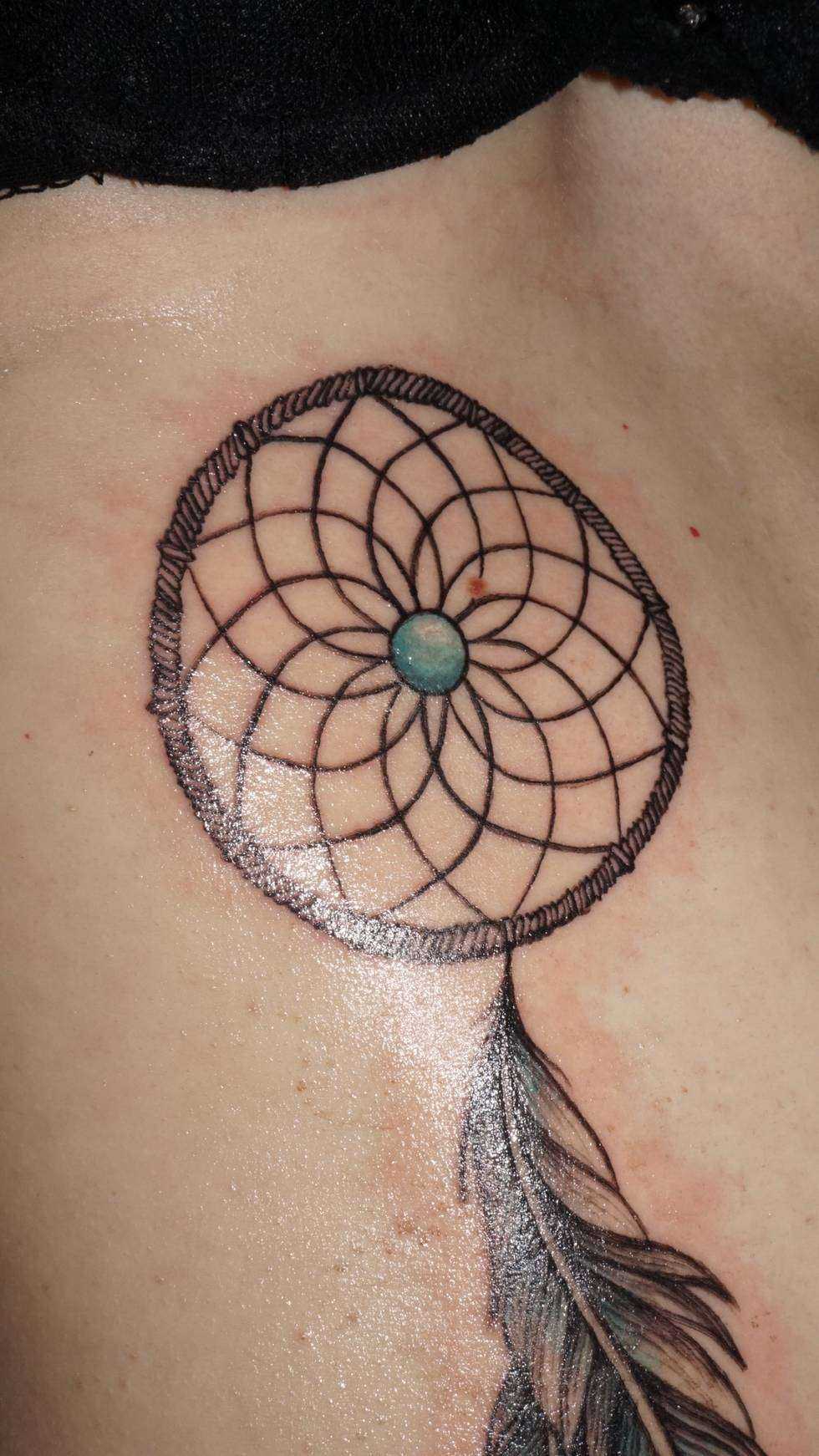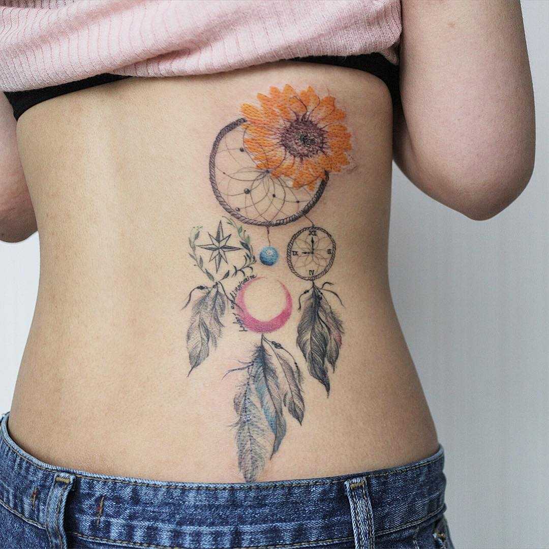 На втором месте популярных мест нанесения тату — ребра. Тут дизайн уже менее объемный, но очень интересный. Если проявить фантазию, то получиться весьма оригинальная и необычная идея для тату. Можно отметить Ловец снов в образе подковы вместо деревянного обода. Это позволит не только защитить обладательницу от дурного влияния и негатива, но и будет притягивать удачу.
