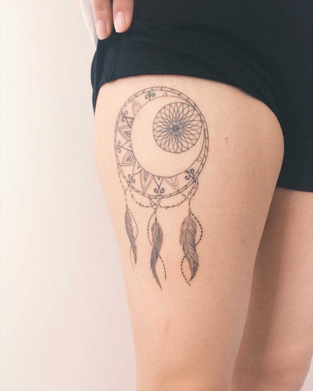 Идеи по дизайну подобной татуировки могут быть очень разными. Изображение легкое и красивое, несет в себе глубокий смысл. Особо строгих ограничений в выборе, на какую часть тела наносить изображение, нет. Однако, как говорилось выше, лучше нанести в районе шеи или плеча. Также можно нанести татуировку и на запястье, спину, в области бедер или грудной клетки, на рёбрах. Многие люди наносят данное тату на свое тело именно с этим символом, рассчитывая на то, что они будут защищены от сглаза, негативной энергии и иметь спокойный, здоровый сон