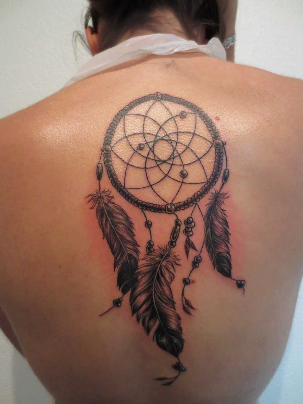 Место нанесения татуировки не имеет строгого ограничения, учитывая наши исследования, девушки в основном выбирают спину. На столь широкой площади для творческого процесса, тату с изображением Ловца снов на прекрасной женской спине получаются довольно большими.