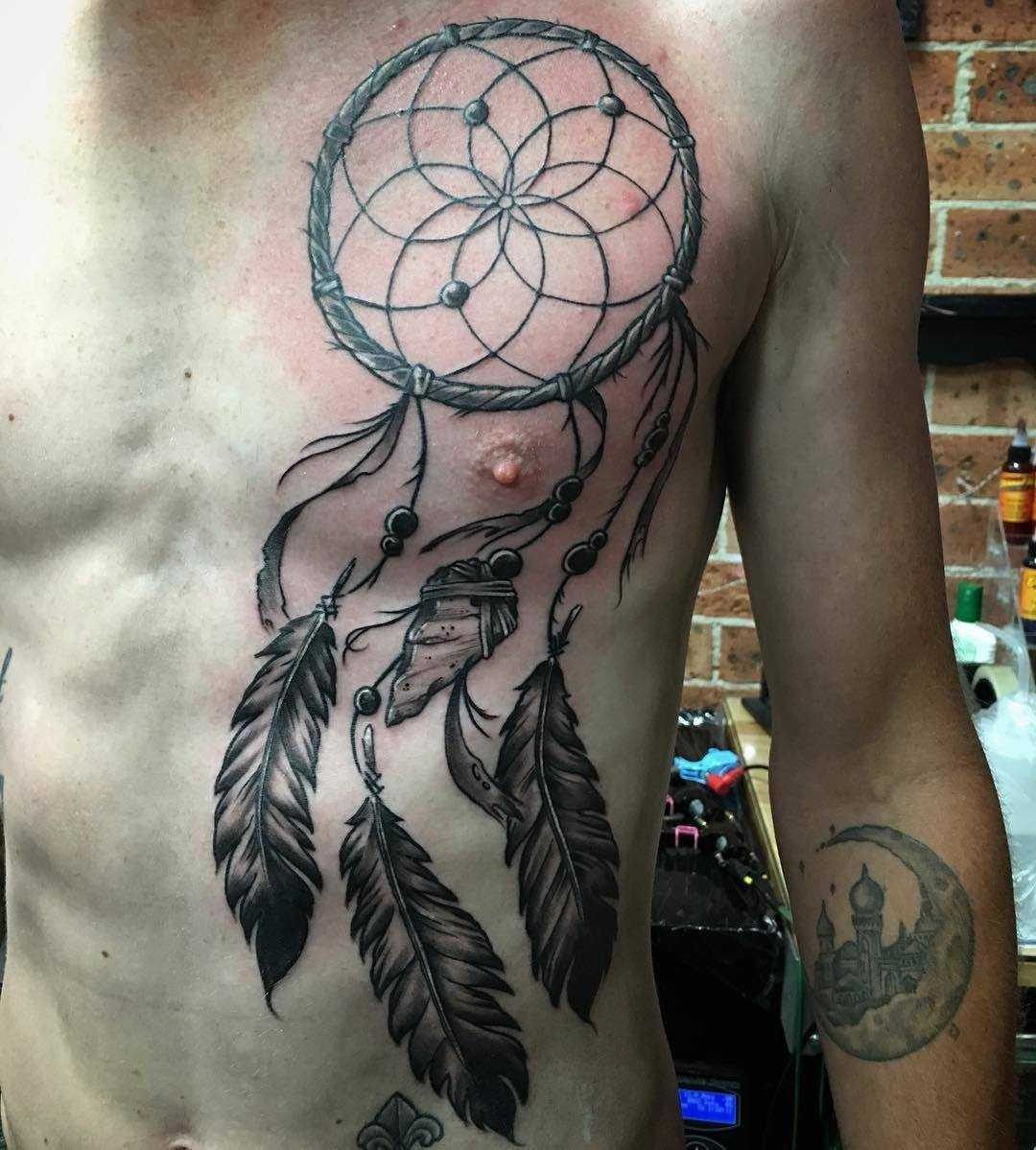 На ребрах или животе Ловец снов набивается не так уж часто. Но в этом случае он является олицетворением привлекательности и чувственности.
