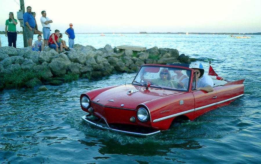 Амфикар придумали в Западной Германии в 1961 году. И да, это плавающий автомобиль. Движение по воде осуществлялось за счет двух гребных винтов сзади, а маневрирование — за счет поворота передних колес. Всего за семь лет было выпущено порядка 3878 автомобилей, большая их часть шла на экспорт в США. Правда, несмотря на новаторство и необычность, машина не завоевала особой популярности. Первая причина — высокая стоимость, а вторая — для использования амфикара нужно было иметь «разрешение на управление спортивными ботами и яхтами», что создавало дополнительные неудобства для владельца. Амфикар был у одного из президентов США — Линдона Б. Джонсона. Поговаривали, что Джонсон — тот еще шутник, — катая в своем амфикаре ничего не подозревающих гостей, с ужасом восклицал, что отказали тормоза, и направлял его в озеро.