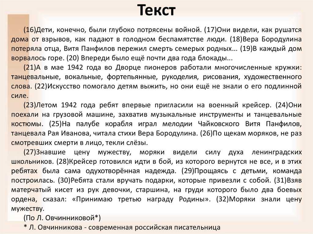 В тексте Л.Е.Улицкой рассказывается о сельском учителе: он лишился руки на войне, вернулся в университет. Сила его духа проявилась в том наслаждении, с которым он накинулся на учёбу: «Какое это было счастье – полных три года он восстанавливал себя сам: чистил кровь Пушкиным, Толстым, Герценом. ». Как видим, человек, пережив войну и ранение, может найти новые радости в жизни. Совсем по-другому переживают трудности его ученики, которые лишились детства: война отняла у них возможность играть, читать книги, развлекаться. Но они стойкие и сильные, и главный смысл жизни у них теперь — работа: «Детство у них давно закончилось, они все сплошь были недоросшие мужики и бабы, и даже те немногие, кого матери отпускали в школу, как будто испытывали неловкость, что занимаются глупостями вместо настоящей серьёзной работы!»