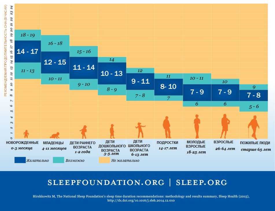 Сон напрямую зависит от возраста: чем младше человек – тем больше времени ему требуется на сон. Вот рекомендации, сколько нужно спать в сутки, которые приводит американский Национальный фонд сна (National Sleep Foundation):