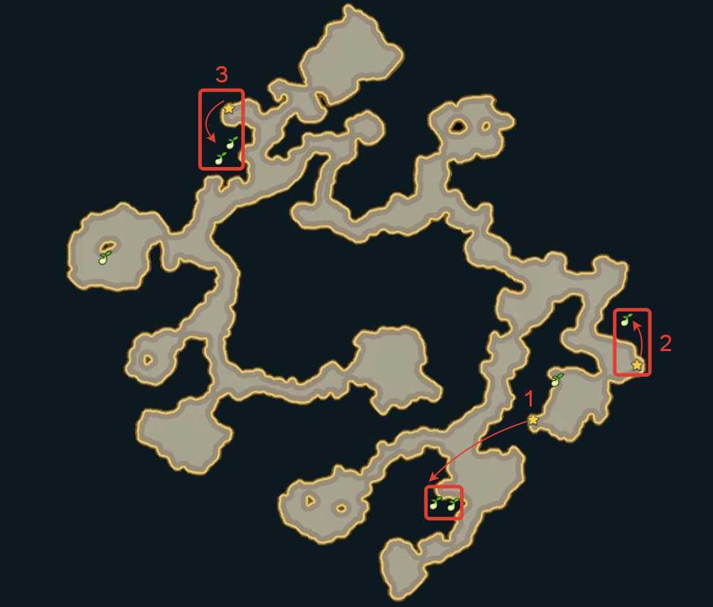 Тайник 1 можно посетить, только зачистив данж от обитающих в нём насекомых. Место входа в него отмечен звёздочкой. Второй тайник нужно лишь найти — проход в него открыт. Ну а в третьей точке необходимо найти точку для спрыгивания в низ, чтобы добраться до спрятанных там семян Мококо.