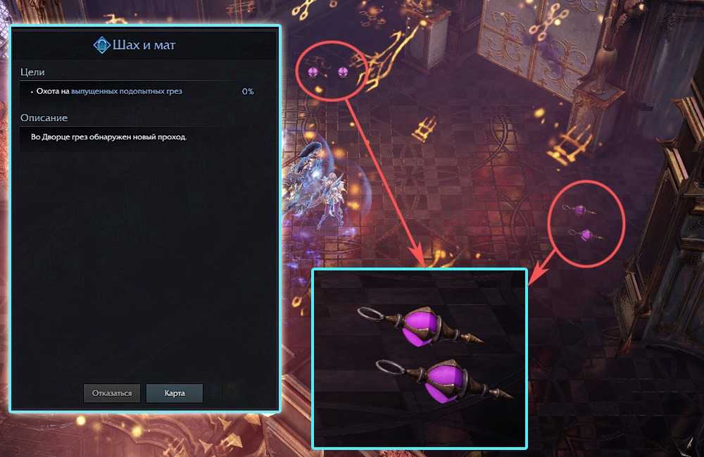 В секретной части данжа автоматически берется квест «Шах и мат». Сначала убиваем элитного моба, берем фонарики, и с помощью них убиваем полчища мобов. Одно заклинание фонарика (клавиша Q) привлекает разбегающихся «Выпущенных подопытных грез» а вторым (W) можно их убивать. По завершению квеста распахиваются двери в покои Черного слона.