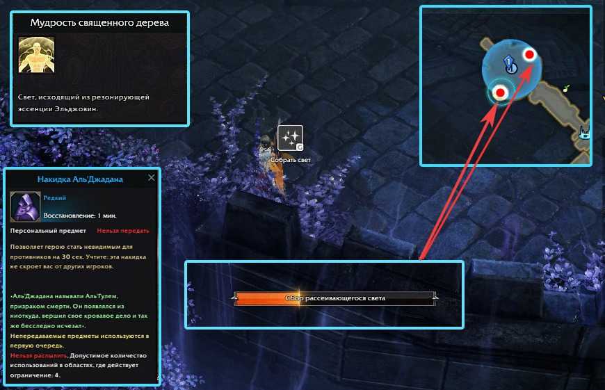 Бафф можно получать в одиночку под защитой невидимости «Накидки Аль’Джадана», но лучше все же прийти сюда с партией и собрать «свет», пока другие игроки отвлекают босса.