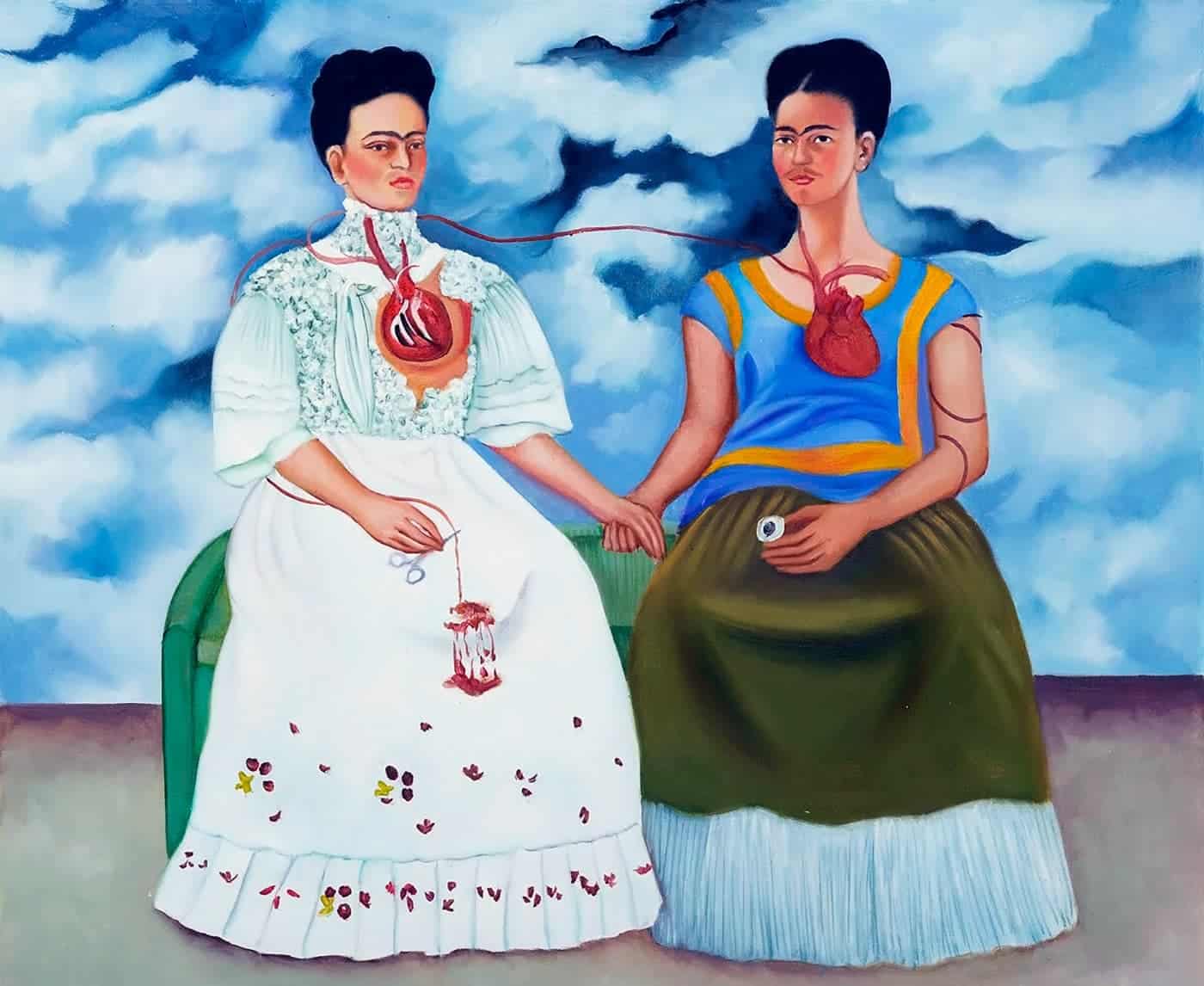 Одна из самых известных работ – «Две Фриды» – написана в 1939 году после развода с мужем. Слева изображена женщина в европейской одежде, которую художница носила до брака. Справа она в традиционном мексиканском платье – так художница выражает с помощью смены наряда приверженность новым идеям национализма, которые были важны для ее супруга.