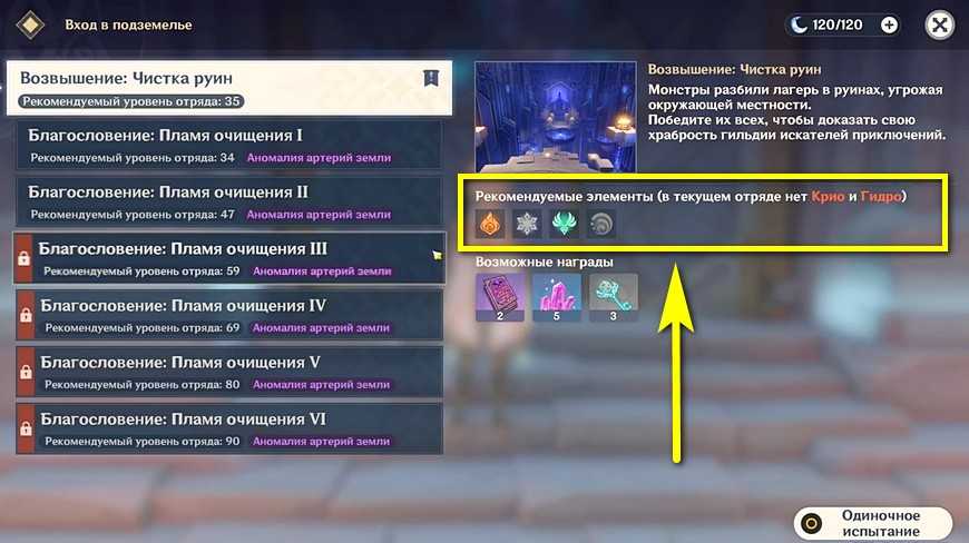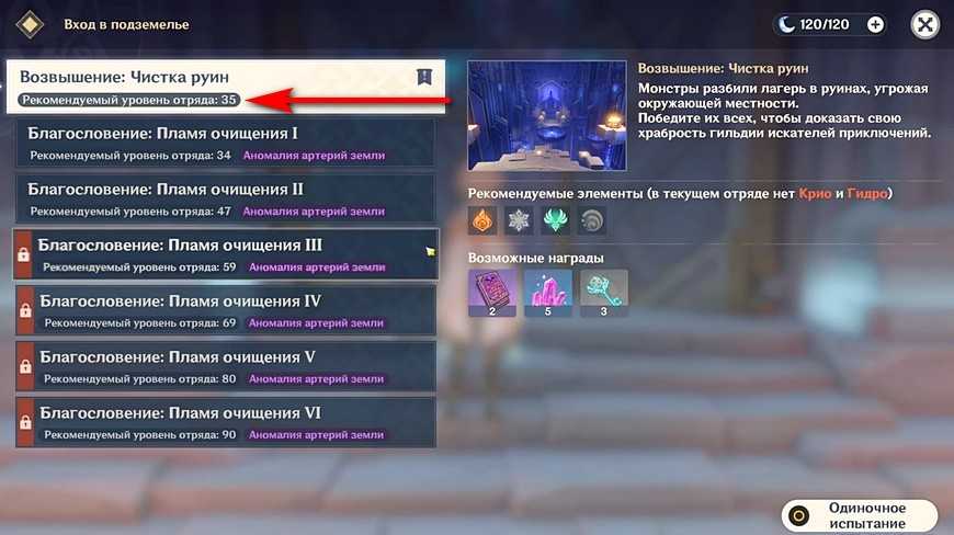 У каждого задания возвышения ранга “Чистка руин” в Геншин импакт также указан рекомендуемый уровень отряда:
