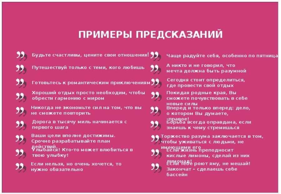 Знаете, как играть в такие предсказания? Тут всё просто – у вас на листочке записаны все предсказания по номерам, а гости вынимают из мешочка билетики с номерками. Когда вынули, то показывают или называют номер билета, и вы зачитываете предсказание под этим номером.