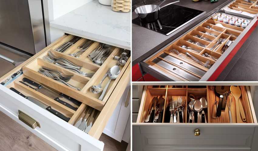 Внутренняя часть выдвижного ящика оборудована специальным разделителем. Лоток для хранения столовых приборов может быть металлическим или пластиковым – как больше нравится. Главное, чтобы конструкция соответствовала размеру ящика, была практичной в плане ухода и легко извлекалась наружу.
