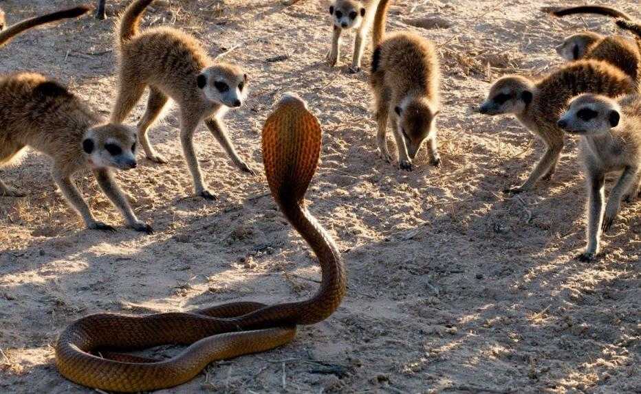 Сурикаты занимаются собирательством отдельно друг от друга, но если семья встретит змею или крупную ящерицу, зверьки объединяться и нападут группой.