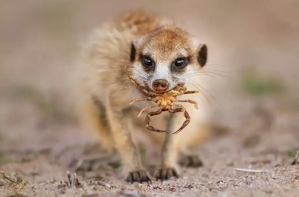 Сурикаты хорошо приспособились к жизни в пустыне и могут спокойно съесть не только безобидных насекомых, но и вполне опасных змей и скорпионов. Секрет удачной охоты заключается в ловкости зверьков и врожденном иммунитете ко многим ядам. Конечно, яд некоторых видов опасен и для суриката, но зверьки с рождения вырабатывают тактику охоты на опасные виды и редко получают серьезные травмы.