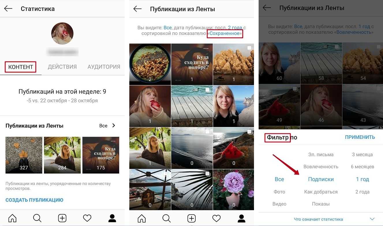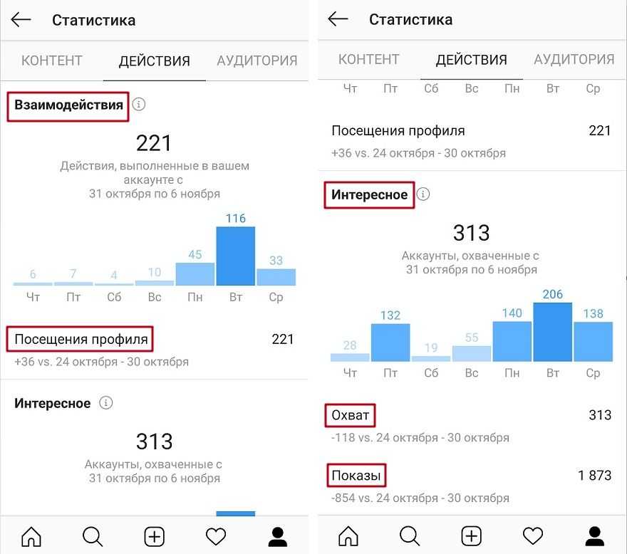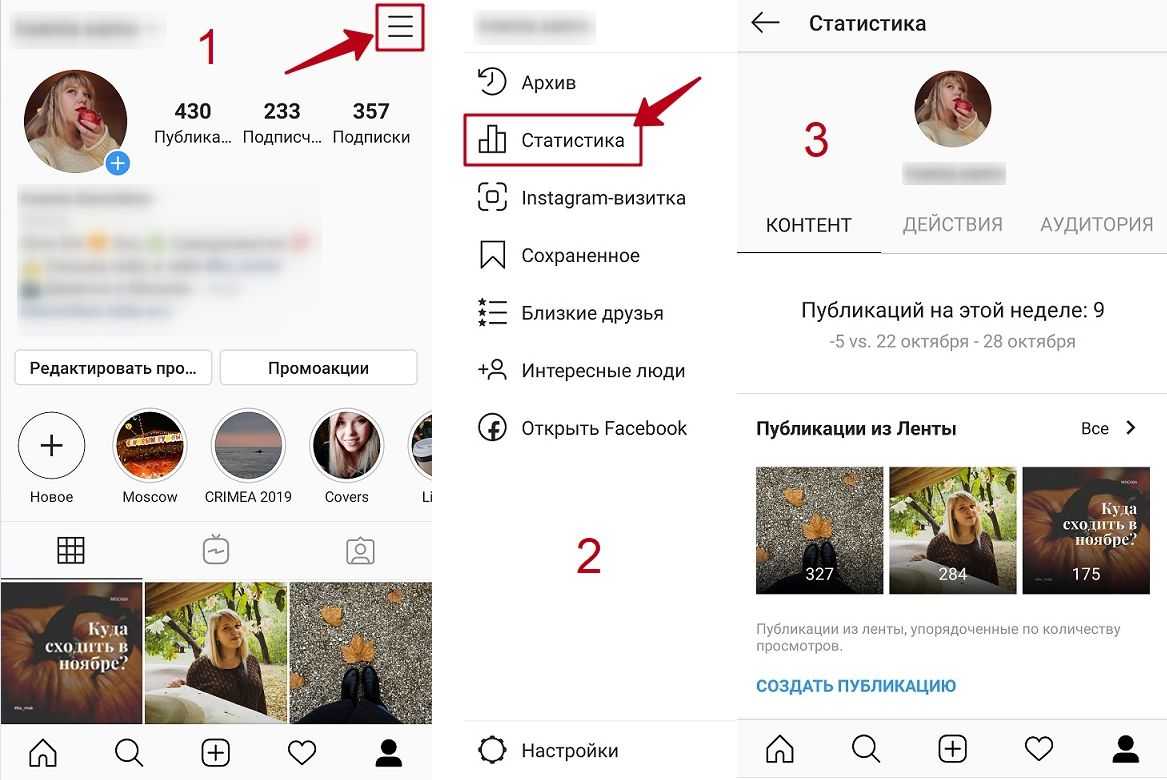 Но чтобы отследить эффективность стратегии ведения канала, недостаточно только этих данных — нужно понимать, как меняются эти метрики в динамике. Для этого используйте «Статистику» Instagram, которая доступна в одноименном разделе аккаунта и представлена в виде 3-х блоков: «контент», «действия» и «аудитория». Рассмотрим каждый из них.