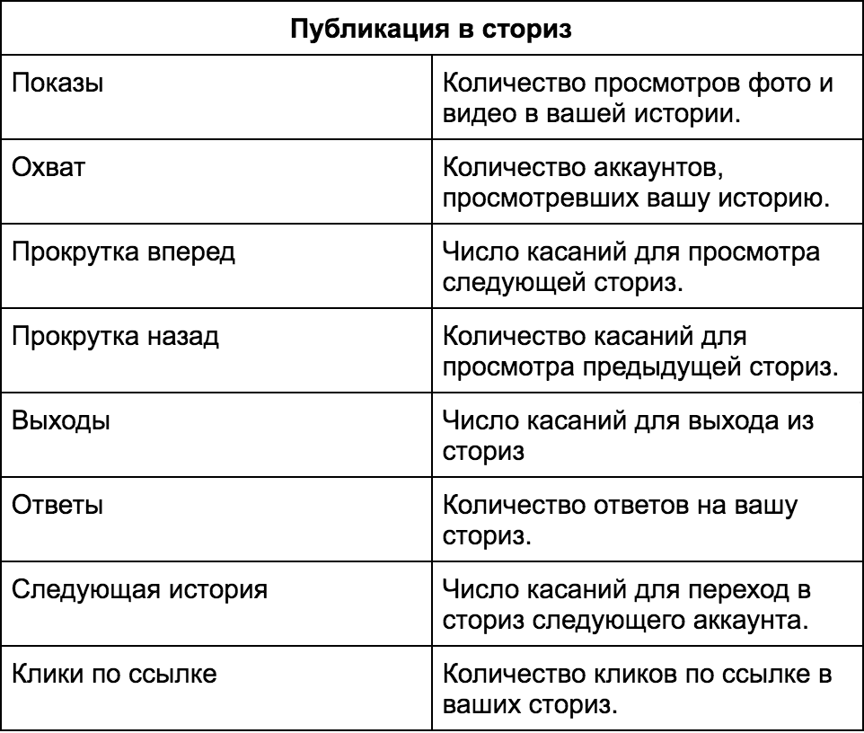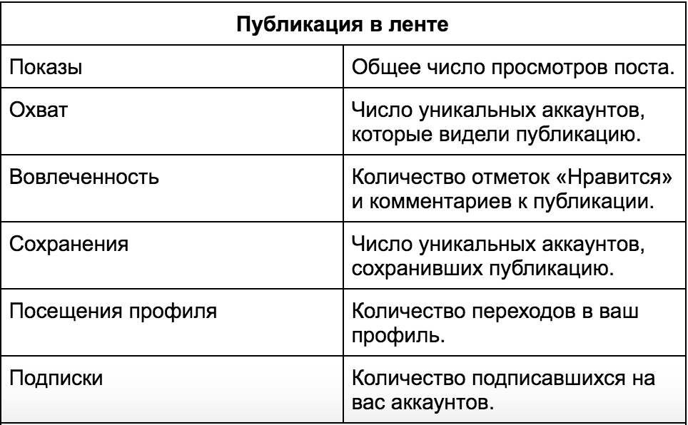 В разделе «контент» представлены статистические данные по вашим публикациям в ленте или сториз. Но, чтобы сделать правильные выводы из этой статистики, прежде всего нужно понимать, что означает каждый из показателей. Иногда новички путают, например, «охват» с «показами», также может быть неправильно истолкована статистика в сториз. Таблицы ниже помогут во всем разобраться.