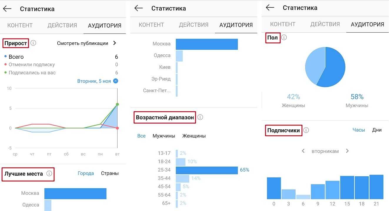 Раздел «Аудитория» показывает количество подписок/отписок и чистый прирост пользователей, а также демографические данные подписчиков: местоположение (по пяти самым популярным городам и странам), пол и возраст. Эта статистика поможет вам лучше понять свою аудиторию, поразмышлять над тем, соответствует ли она вашим представлениям, и, возможно, внести изменения в контент-план.