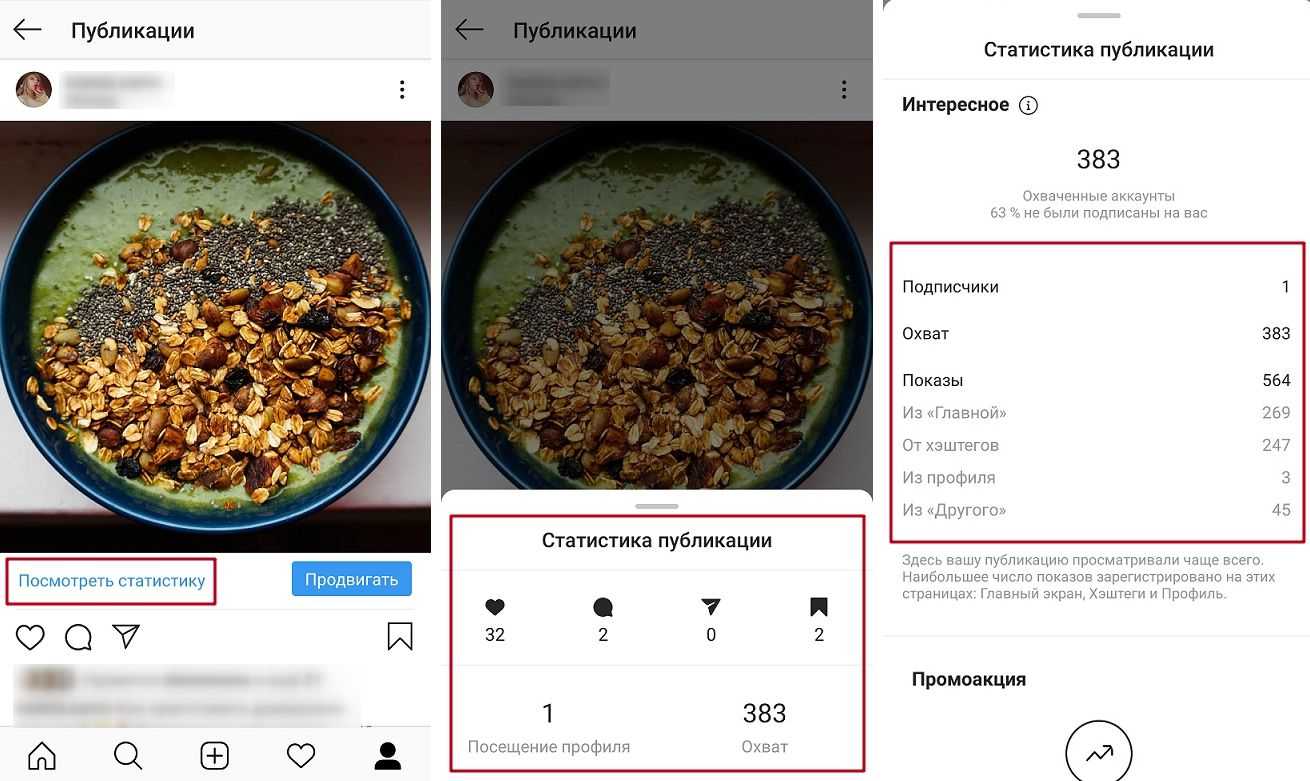 В бизнес-аккаунте доступна как общая статистика профиля, так и данные по каждой публикации. Чтобы посмотреть данные по определенному посту, откройте его и нажмите «Статистика». Вы увидите охват и число посещений профиля, количество лайков, комментариев, репостов и сохранений, а также сводку по показам из разных источников (из «Главной», от хэштегов, из профиля, из «Другого»).